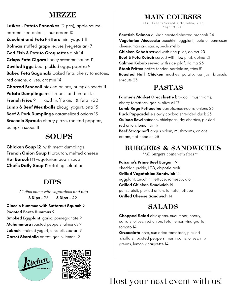 When you step into Kitchen At Cobble Hill, you’re not just stepping into a restaurant, but a celebration of flavors. Nestled at 254 Court St, Brooklyn, NY, the menu here is a delightful mix of comfort and creativity, offering something for everyone. Whether you’re craving something light and fresh or a hearty dish to dig into, each option has been crafted with care. The small plates are perfect for sharing with friends or diving into solo, while the larger entrees will have you savoring each bite. From perfectly grilled meats to inventive vegetarian dishes, there’s always something to surprise and satisfy your palate. The Kitchen At Cobble Hill Menu also shines with seasonal ingredients, ensuring every visit feels like a fresh experience. Whether you're here for a quick bite or a leisurely meal, the flavors will keep you coming back for more.